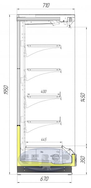 Набор опций достаточно обширен и, как правило, в состоянии удовлетворить потребности любого нашего клиента. Все охлаждаемые горки имеют подсветку экспозиции, как минимум, в виде одного ряда люминесцентных ламп, размещенных на канапе. Горки могут быть укомплектованы подсветкой каждого уровня полок, что позволяет в максимальной мере увеличить рентабельность оборудования.